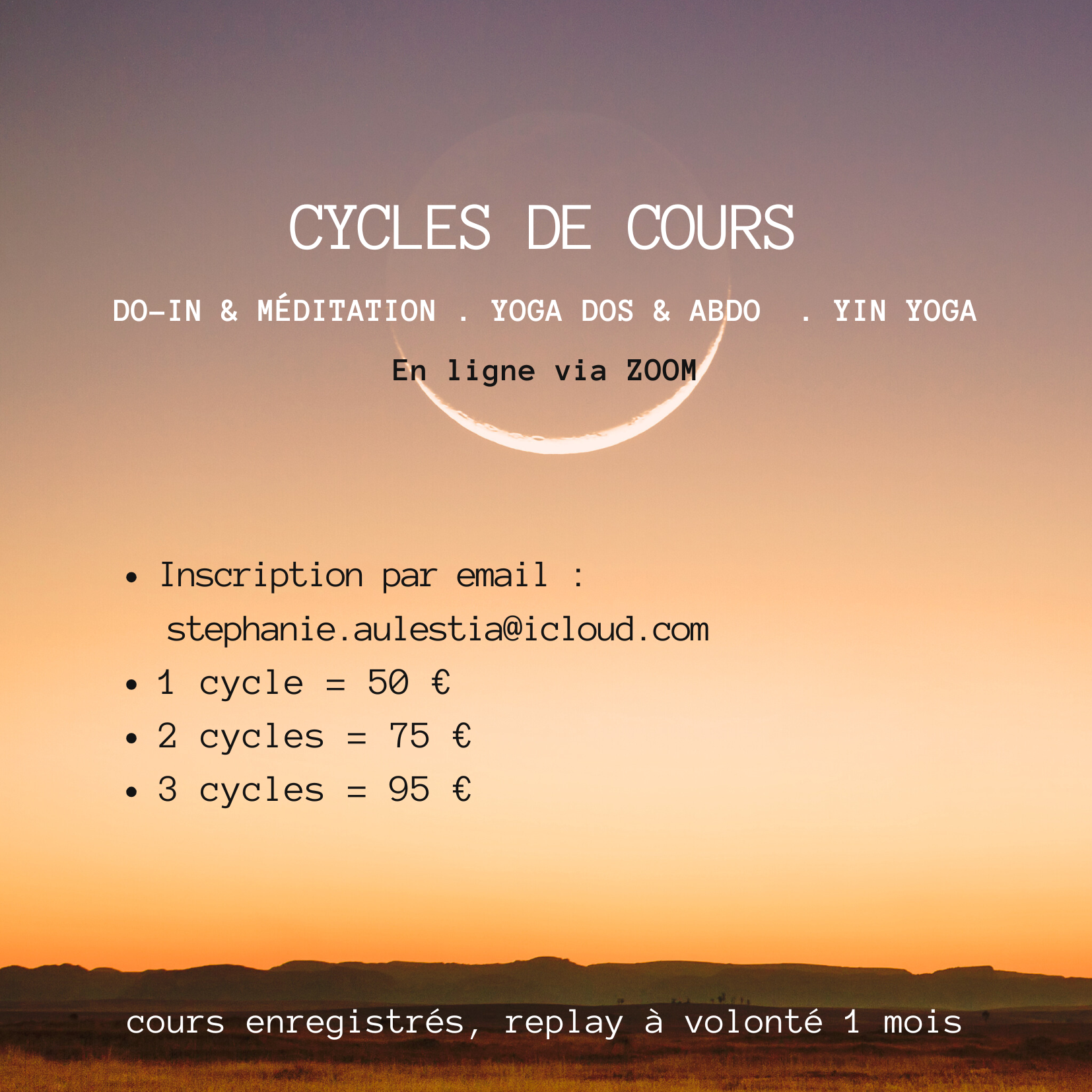 Date de la mise en ligne du cours : Pendant le cycle vous recevez l'enregistrement du cours le mercredi avant midi. Le lien de visionnage est envoyé email, d'où l'importance de vous inscrire par email ;-)